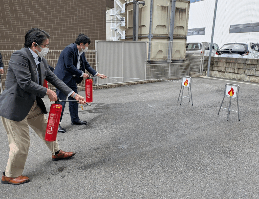 株式会社グリーンズ四日市本社 消防訓練実施 お知らせ消火器 投稿日2025年11月21日 2025.11.21 ~火災を想定した実践訓練で安全意識を再確認~ 株式会社グリーンズ四日市本社では、2025年11月10日(月)に消防訓練(消火訓練、避難訓練、通報訓練)を実施しました。消防法に基づき、年2回の消防訓練を計画的に行っておりますが、今回は初の試みとして、防火扉及び防火シャッターを全て閉じた状態で避難訓練を実施しました。 この訓練では、防火扉や防火シャッターの作動時に、周囲に障害物(デスクや備品など)がないかを確認するとともに、閉鎖された状態での避難経路の安全性を検証しました。 消防訓練終了後には、希望者による水消火器の操作訓練やAEDの使用訓練も実施され、参加者の防災意識向上につながる有意義な機会となりました。 火災発生時には、緊張や混乱により、普段は問題なくできる行動が難しくなる可能性があります。だからこそ、日頃から実際の状況を想定した訓練を重ねることで、万が一の有事に備えてまいります。 ■防火扉及び防火シャッターを閉じた状態で訓練を実施しました。 ■水消火器の操作訓練 水が出る消火器で実際の使用方法を学びました。 ■AEDの使用訓練 マネキンを使用し、AEDの使用訓練に加えて、周囲の人への指示出しや胸骨圧迫など、救命処置の一連の流れを実践的に訓練しました。 グリーンズのサステナビリティ活動