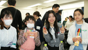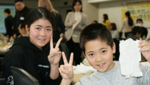 武蔵野大学工学部サステナビリティ学科の学生による分かりやすい説明のもと、子どもたちは実際に紙漉きに挑戦し、身近なバナナが紙へと姿を変えていく工程を体感しながら、自分だけのバナナペーパーを完成させました。さらに、自ら作成したバナナペーパーに色付けを行い、その紙を使用してオリジナルのキーホルダーや缶バッジを製作するなど、ものづくりの工程を楽しみながら取り組みました。